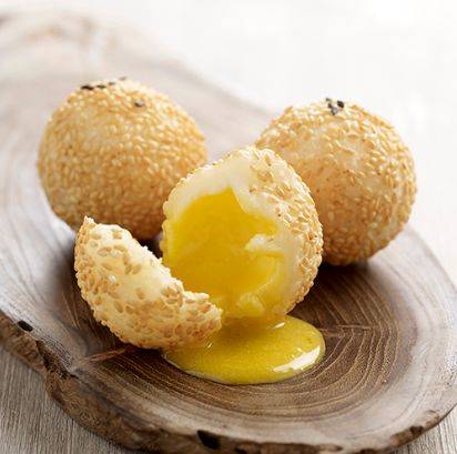 这个形状像卡通猪的流沙包子。这简直不要太可爱,都不忍心吃掉它,但是不要让可爱的外表欺骗,甜味和咸味的液化咸蛋黄会融化你的味蕾,吃了这个你就是这条街最靓的崽。