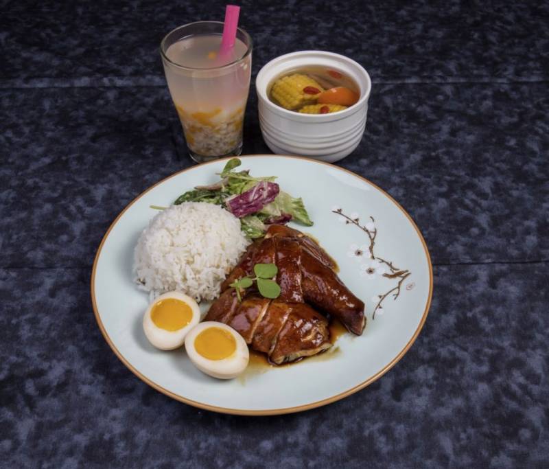 套餐F:中国玫瑰红酒炖鸡肉(古法玫瑰鼓油鸡饭),每日滋补汤(自生时靓炖汤)和自制大麦南瓜饮