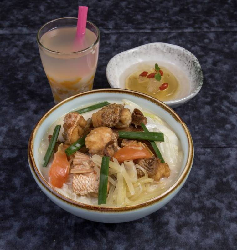 套装B:浓汤鱼头水粉米粉,含有冷冻柠檬草果冻和桂花糖浆(桂花芦荟香茅冻)和自制大麦南瓜饮料(金瓜薏米水)靓炖汤和自制大麦南瓜饮(金瓜薏米水)