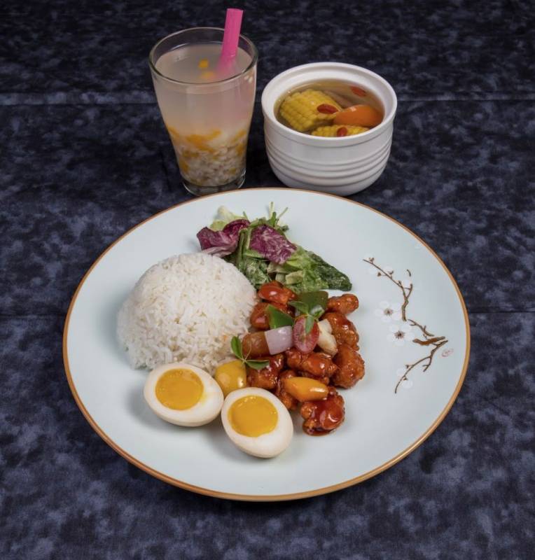 套餐E:Hawthorne Sweet&Sour Pork with Rice(山楂糖醋咕饭肉饭)与滋补时日靓炖汤和自制大麦南瓜饮