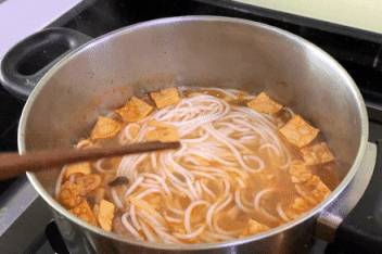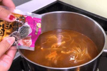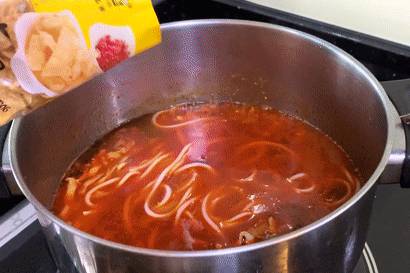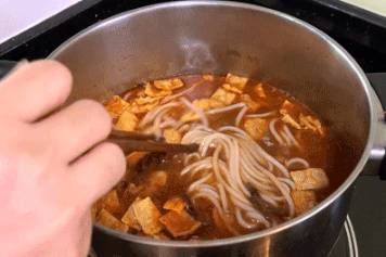 将好欢螺给按步骤煮好。先用热水浸泡米粉十分钟,按顺序倒入各种配料后再煮五分钟,这样口感会比较好。