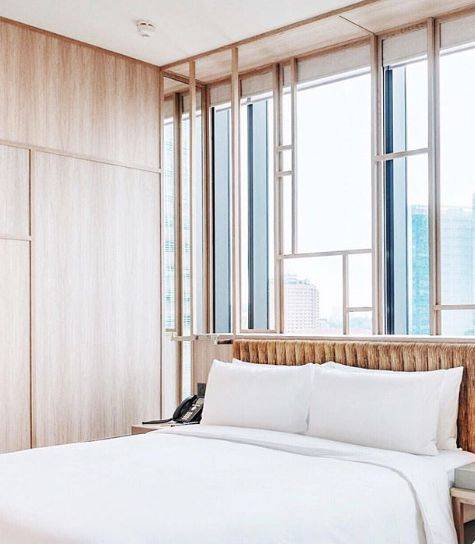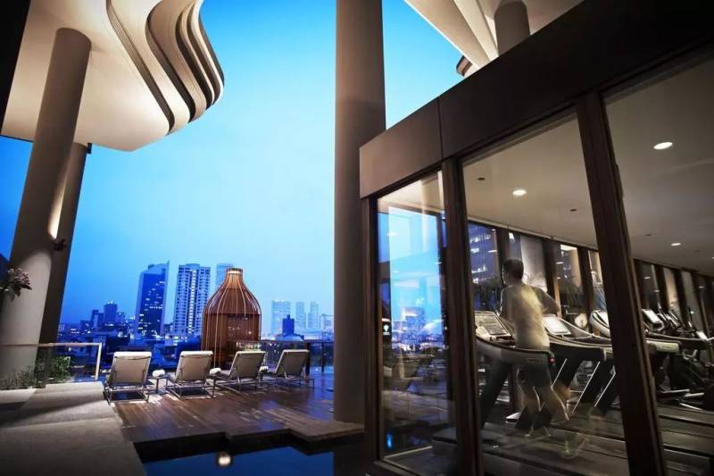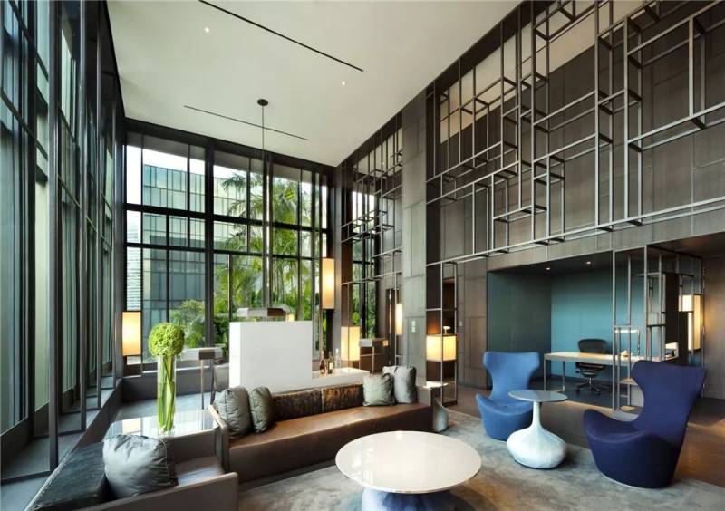 大堂高楼底的设计延续了水稻田的氛围,逆向的梯层令宾客的视野向上延伸。设计师广泛运用玻璃和镜子,从落地玻璃洒进的自然光提升大堂的空间感。