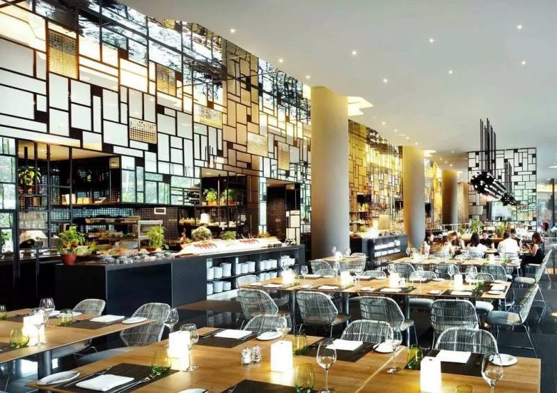 沿着两旁以流水装饰的实木走廊走到餐厅LIME,给人一种身临河畔的感觉。餐厅门口前,穿过水纹镜子的下方,看到布以绿色植物和苔藓的生机勃勃的植物墙,置身其中,感觉走进了大自然。