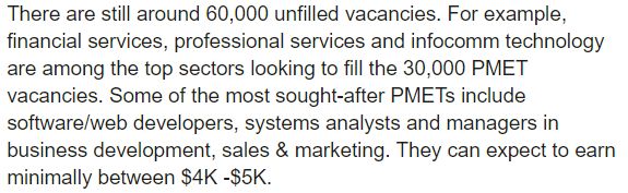 软件或网络开发者、系统分析师、商业发展和销售与营销经理等最缺人,这些行业的最低预期薪资在4千到5千新币。