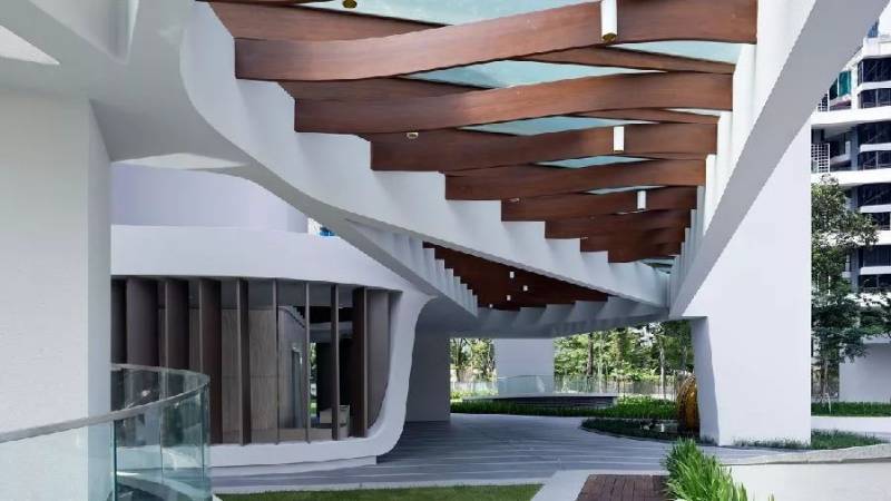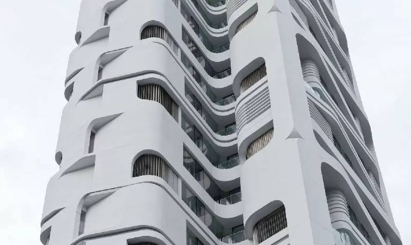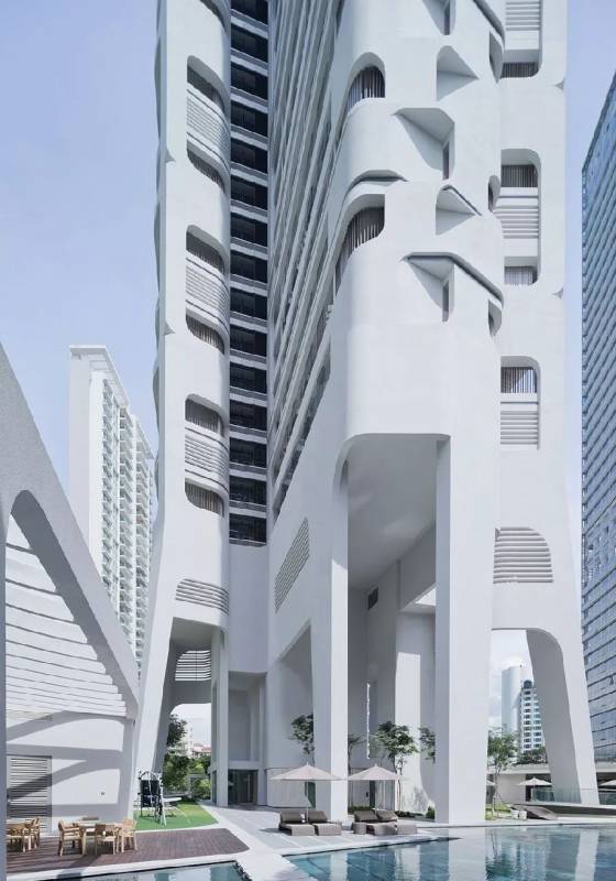 位于新加坡雅茂园7号的雅茂公寓,拥有优越的地理环境,紧邻乌节路豪华购物区,可俯瞰新加坡市容全景和周围东西两侧的广袤绿化区。这栋36层高,17178平方米的住宅大楼的主要设计理念是多层建筑与新加坡“花园城市”固有自然景观的相互呼应。设计师通过四大细节将这种景观概念融入设计:通过细节构成多样化的有机纹理和图案,打造连贯的建筑外观;通过大玻璃窗、飘窗和双高阳台,实现广阔的城市视野;通过采用“居住景观”的理念,呈现两种公寓类型的设计;以及通过一个开放的框架支撑起一个凸起的结构,实现地面花园的透明度和贯通性。雅茂园的立面设计是由细节设计发生的。这一设计将诸如凸窗和阳台等结构元素交织形成连续的线条。公寓每隔4层重复同样的立面外观,圆润的玻璃打造出无柱角落,在视觉上将室内空间和室外阳台相互融合。交织的线条和表面包裹着整栋公寓,在实现持续的日照屏蔽时,也确保公寓的内在品质和建筑物的外观形成一个统一的整体。