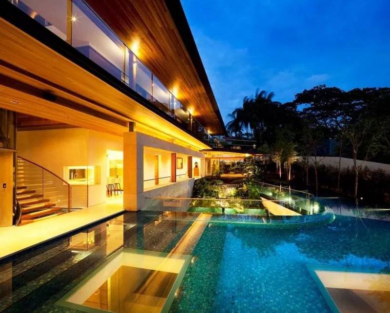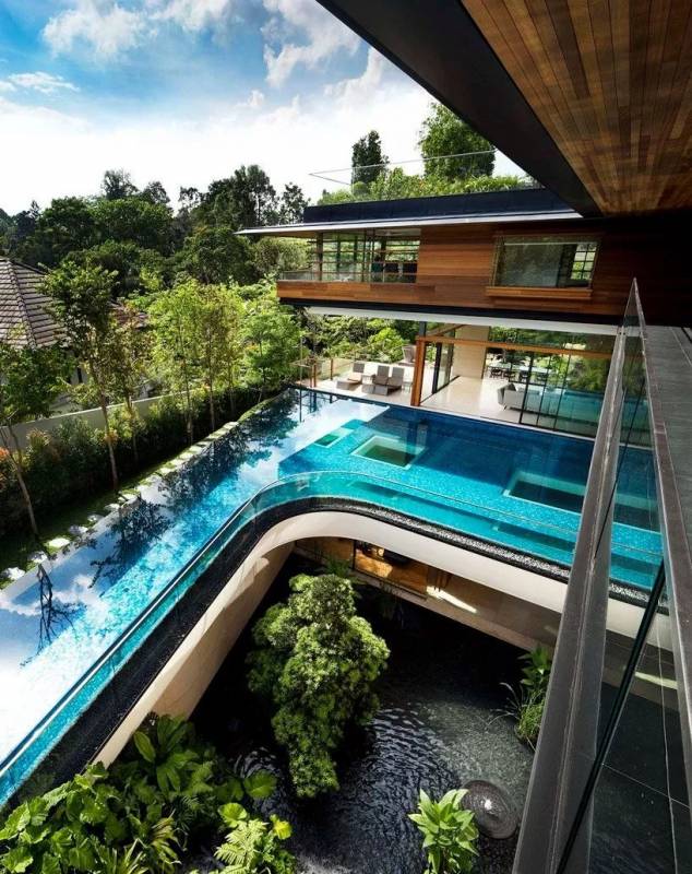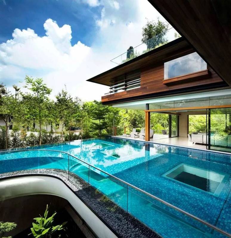 住宅的规划由建筑师划分为两层,并附加一个地下室。一进入一楼,居民就被迎接进入到充满阳光的社交空间。这一层包含了厨房、起居和用餐区等功能,其特点是有着大量的可开启的玻璃隔断,使室内开放到自然中,并提供交叉通风。大水池和瀑布也占据了第一层,为“botanica”住宅带来了郁郁葱葱的热带氛围。