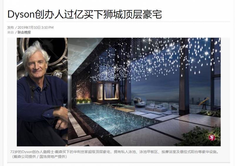 戴森Dyson公司的创办人詹姆斯·戴森,今年年初把公司的总部搬到了新加坡,继而挥金如土买下豪宅后。