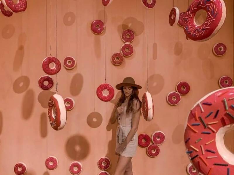 巨大的粉红色甜甜圈,从天花板垂坠而下,像是在沐浴一场甜甜圈雨,拿起手机,尽情的享受聚光灯的美吧。