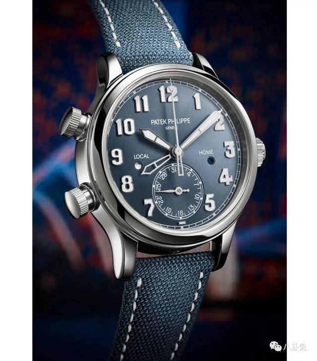 旅行时间腕表Ref.7234A-001限量400枚,这个蓝色调在这次的特别款中很突出,也颇有优雅感,有意思的是,百达翡丽第一次使用了织物表带。