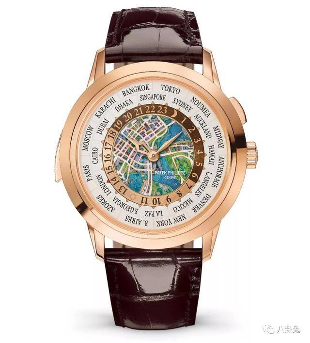 最后还有一块三问世界时Ref.5531R-010,表盘中间是用掐丝珐琅制作的新加坡地图,东八区代表城市也是新加坡,只有5枚。