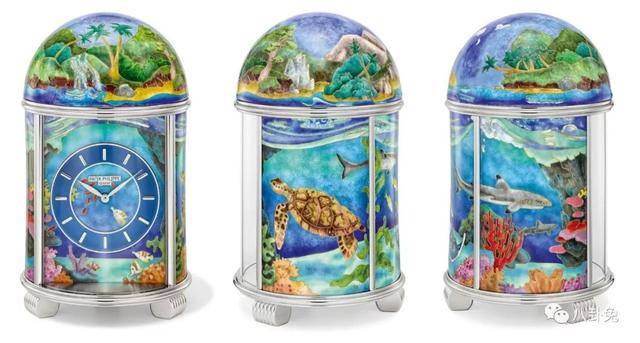 这座以“热带岛屿”为主题的百达翡丽圆顶座钟(Ref.20087M),其掐丝珐琅装饰描绘海底世界的奇妙景观。