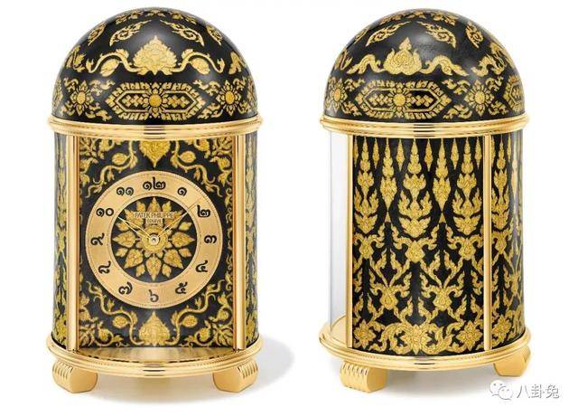 这座百达翡丽圆顶座钟(Ref.20074M)饰有采用掐丝珐琅工艺打造的“泰式装饰”图案并镶嵌银色亮片,以展现泰国在建筑装饰和传统织物上的审美。