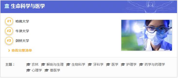 专业包括:农林、解剖与生理、生物科学、牙科学、医学、护理学、药学与药理学、心理学、兽医学