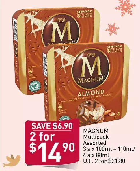梦龙的忠实爱好者们终于可以享口福啦!购买2盒Magnum Classics,Doubles或Minis可节省6.9新币哟!