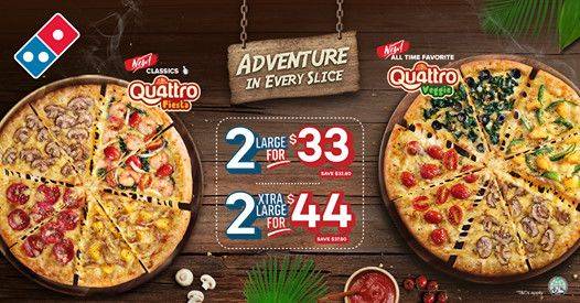 Domino披萨再出么蛾子!两份大号披萨只要33新币,超大号披萨只需44新币。这还不够?那就一份披萨给你4种口味选择,吃不吃就看你啦!