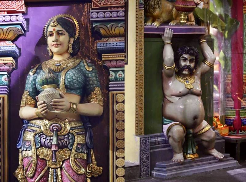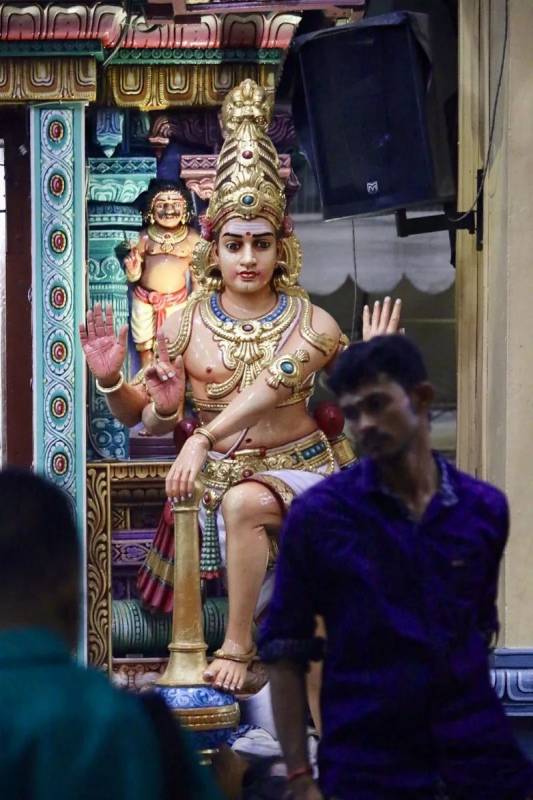 很多商店的大幅海报上,都印着穿民族服装、化浓妆、全身挂满黄金的印度美女,招牌文字是英文和印地文。多光多彩的印度神庙,在黑夜以及黑色皮肤的大海里,像是一座座高耸岛屿,灿烂辉煌。神庙的外墙布满印度教神像,他们个个形象丰满富丽,和寒酸的信徒们相比,更显张力。在破旧里,神庙显得崭新、整洁;在灰暗里,神庙显得鲜艳;在尘世里,神庙显得更加神圣。神庙狭窄的大门里传出诵经的声音,浑厚又洪亮,充满了威严和热情的能量,佛教形容释迦牟尼的声音如“金刚狮吼”,我想,几千年前佛陀的讲法之声,就是如此的吧。