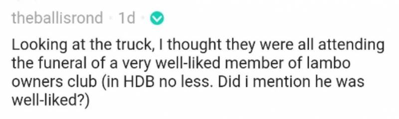 “看见组屋远处有卡车不?我猜这是个葬礼,死者是兰博基尼车友会的人,引来好多朋友开兰博基尼参加。”
