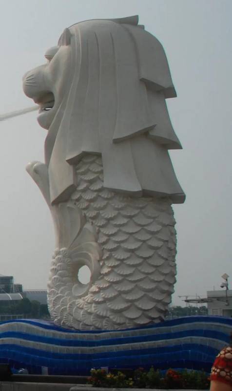 穿花园式街道,沿海滨大道,过旧国会大厦和高等法院,来到坐落在海边的鱼尾狮公园,一眼看到大小两尊鱼尾狮身雕塑,屹立在海边新加坡河畔。大小两尊是一对母子,母狮朝向大海,嘴里喷射出一股青泉,像一条白色的绸带落在水面。狮头威严、雄健;鱼尾滑润、平和。看上去,既有勇猛的一面,又有柔和的情调,强悍和柔情的结合,正是新加坡的象征。据介绍,此两尊母子狮雕是著名的雕刻家林南先生和他的两个孩子共同雕塑,完成于1972年5月。