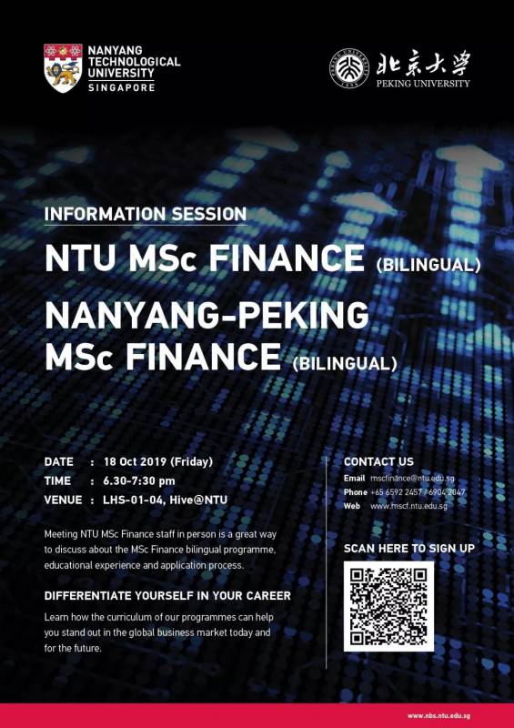 为介绍课程最新进展,金融硕士学位课程办公室将于2019年10月18日在新加坡南洋理工大学举行说明会。欢迎有兴趣的同学报名,也欢迎具有理工科专业背景的同学参加,与我们的教授面对面沟通,深入了解课程讯息和相关申请要求。