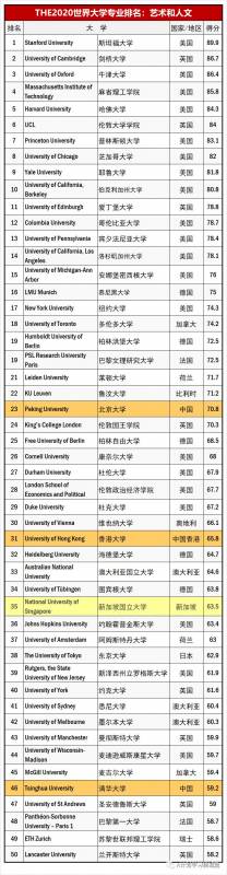 泰晤士高等教育发布2020年世界大学艺术和人文专业排名,该排名的评比采用了和泰晤士世界大学排名相同的评比指标,但评比方法经过重新校准,以适应不同专业领域。