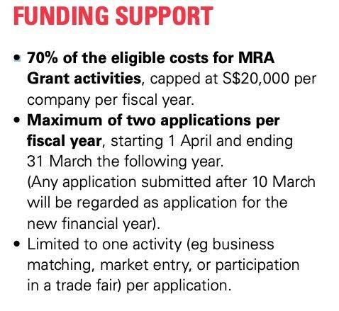 新加坡的中小企业(SME)将获得市场进入资助金(MRA),以帮助您将业务拓展到海外,从而在国际上获得更大的市场。