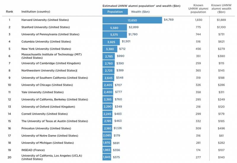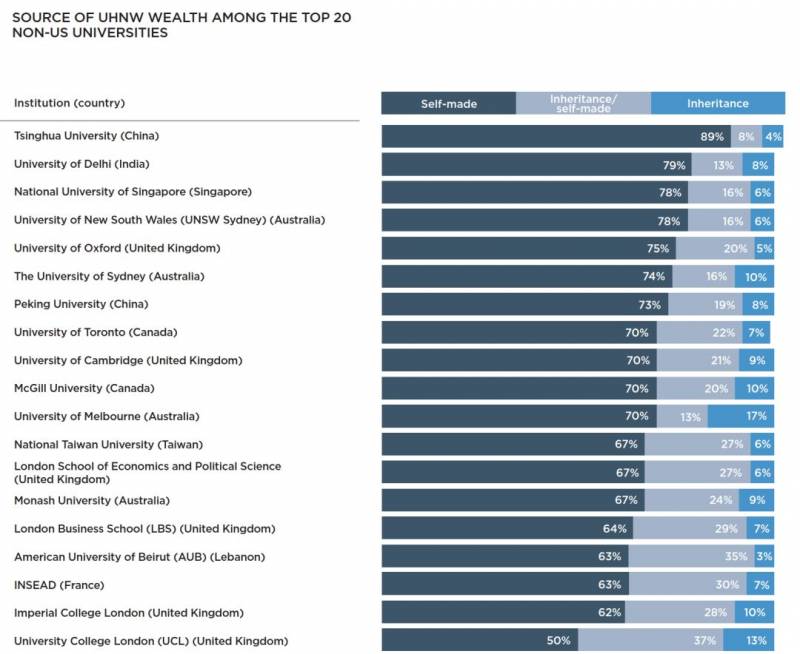 据2019年财富-X公司(Wealth-X)的“大学超级富豪校友榜”的调查显示,亚太地区已成为最盛产超级富豪校友(个人资产净值达到3000万美元及以上)的地区,其中新加坡国立大学、清华大学和北京大学霸占了前三名的宝座。