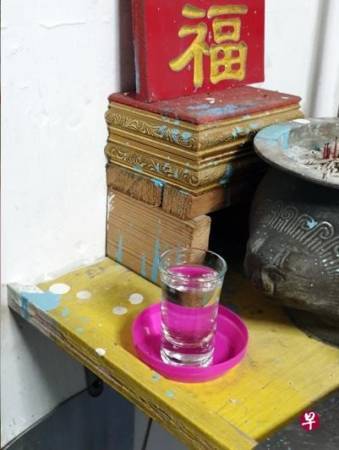 如今门外神龛仍有油漆痕迹,屋主一家人当天花了近五小时也都无法将油漆清理干净。(梁麒麟摄)