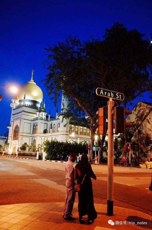从莲山双林寺出发,坐公交车到著名的阿拉伯街(Arab Sreet)时已经夜幕降临,整条街都是阿拉伯风格店铺,以卖各类传统布料和摆件为主,沿街漫步,最显眼的当属新加坡最大的穆斯林宗教建筑苏丹回教堂(Masjid Sultan),两座金色的园顶在月色映衬下格外壮丽,我抵达这里的时间可能刚好是祈祷的高峰期,穆斯林信徒来来往往,脱鞋入殿礼拜祈祷。与佛教寺院不同,这里虽然信徒虔诚且众多,但信徒们的眼神总是给我一种排外而压抑的感觉,对于我来说,在这里无法感受到宁静,反而是一种不知来自何处的恐慌感,也许这也是一种形式的宗教力量吧。