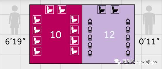 以下图为例,同样大小的男女厕所,男厕可塞下12个小便池外加2个马桶,女厕只能放下10个马桶。坑少了,排队时间自然是要更长了。