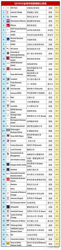 今年的市场营销硕士一共涵盖了77多大学,其中有24所美国的大学、18所英国的大学以及10所法国的大学。