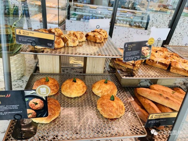 小咸面包区:面包不论咸甜都是人间美味,咸面包内馅更加丰富,香气更加浓郁。吴宝春面包店在咸面包上进行了口味创新,推出了许多新加坡限定,比如沙爹口味。其他口味还有洋葱、蒜香、香肠、明太子等等。最后泡椒鸡口味成为了我的囊中之物~