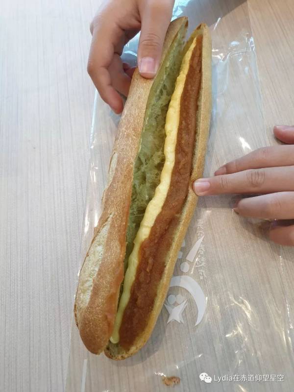 侧面打开看看,其实内有乾坤——放了Kaya酱哦!所以叫“斑兰棒棒”!法棍外皮的扎实感,配着里面斑兰酱的香甜,很好的组合