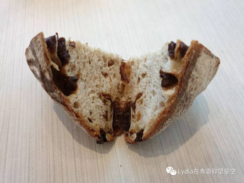 里面有荔枝干,面包表皮有些韧劲,但是里面是湿润的软,很标准的欧包,但是又有东方的特色。