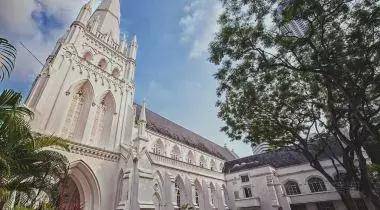 教堂旁边就是地铁City Hall站,交通十分方便。出了地铁站便是安德烈教堂了,一座洁白的哥特式教堂,高高的尖顶直插蓝天,很有贵族气质。很多新加坡当地的新人会选择在这里拍摄婚纱照。