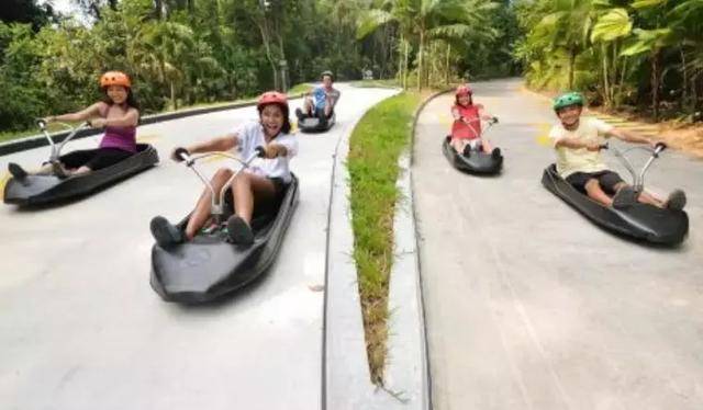 在英比奥山顶坐上圣淘沙天际线斜坡滑车,从12层楼的高度沿着650米的蜿蜒跑道往下滑冲,感受刺激又随意的滑坡体验,享受乘风滑行的舒畅快意。