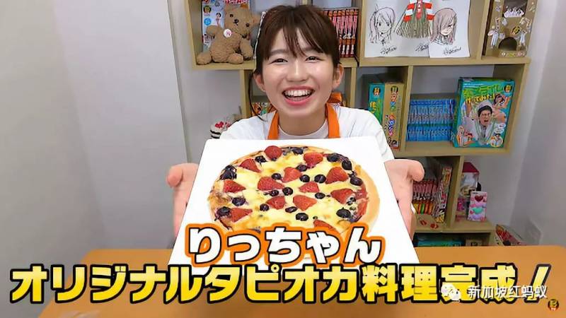 另外一位日本Youtuberりっちゃん所制作的特殊披萨,是先在披萨皮上涂一层草莓酱,接着放上珍珠,再铺满起司条。最后再依照喜好放上草莓和葡萄。