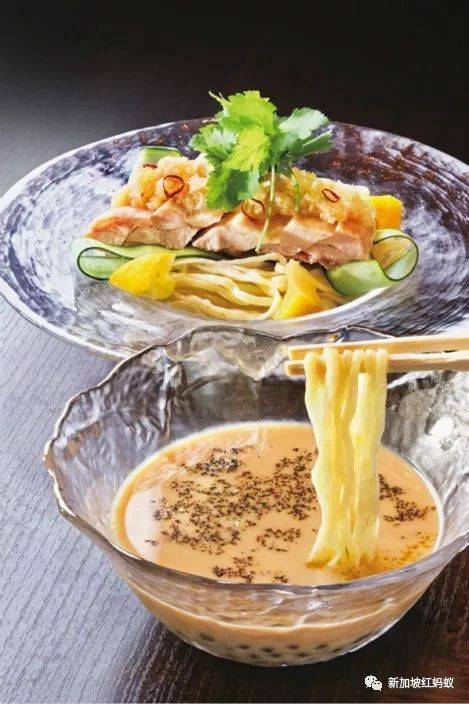 面如其名,沾面汤汁就是一碗珍珠奶茶。汤头用鲣鱼和牛奶调味,碗里的珍珠则是用酱油、鲣鱼和砂糖调味。冷面中也有撒入黑色的伯爵茶叶颗粒。