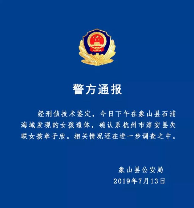 7月13日下午,浙江宁波象山县传来噩耗,发现了疑似杭州9岁女童章子欣遗体。