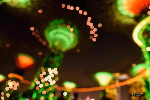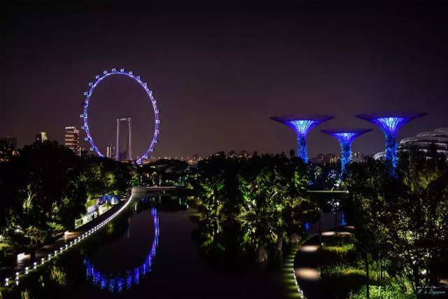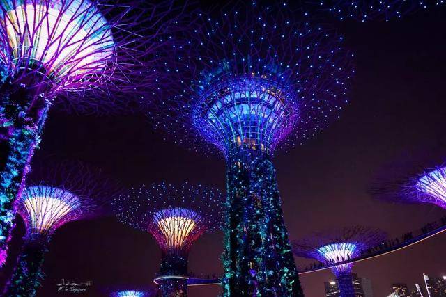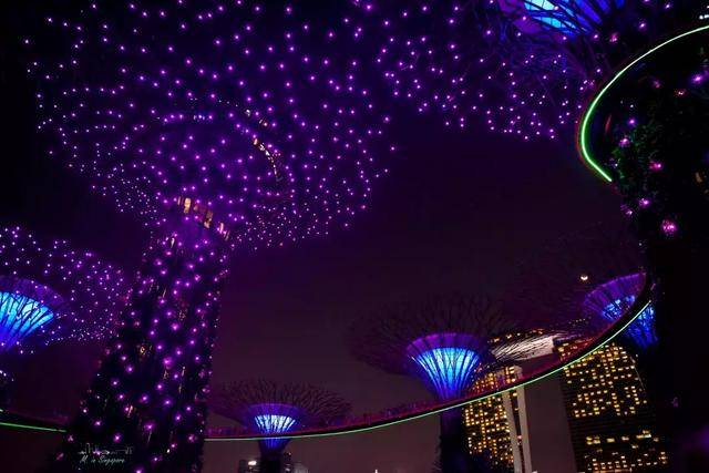 在夜幕低垂时分,空中走道会上演一场花园狂想曲,席地而坐,仰头而望,看这些巨树随着音乐变幻著璀璨的模样,是值得回忆的美丽时光。