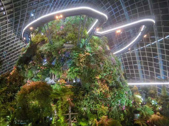 云雾林比花穹占地面积略小,但是穹顶很高,一进入馆内便直面高达35米的人造瀑布,清凉湿润扑面而来。漫步其中,宛若置身于热带雨林,身边环绕着在湿润气候中愉悦生长的兰花、猪笼草和蕨类植物。攀上最高处再顺着“云雾步道Cloud Walk”盘旋而下,在植物的世界里尽情徜徉,让人尽饱眼福。