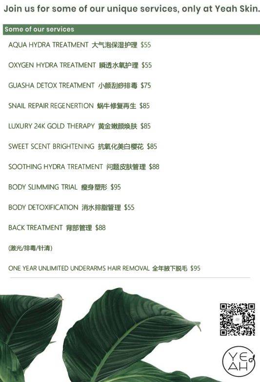 除了以上这些皮肤管理项目之外,Yeah Skin还有绿意抗痘护理和干细胞再生护理等等。绿意抗痘护理可以让脸部水分平衡,不易长痘痘,改善痘痘肌。干细胞再生护理有着美容养颜,抵抗衰老的功效。