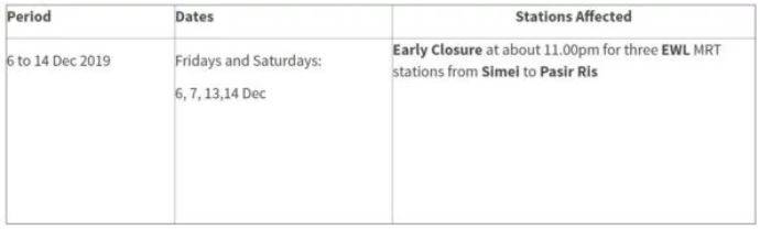 而从12月6日至14日,从Simei到Pasir Ris的车站也将在11pm提早关闭。