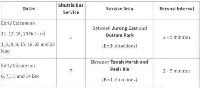 如果您是受影响的通勤者之一,请注意这些可用的班车服务。在10月-11月这段提早关闭的时间,往返Jurong East和Outram Park之间的通勤者可以使用Shuttle Bus Service 1