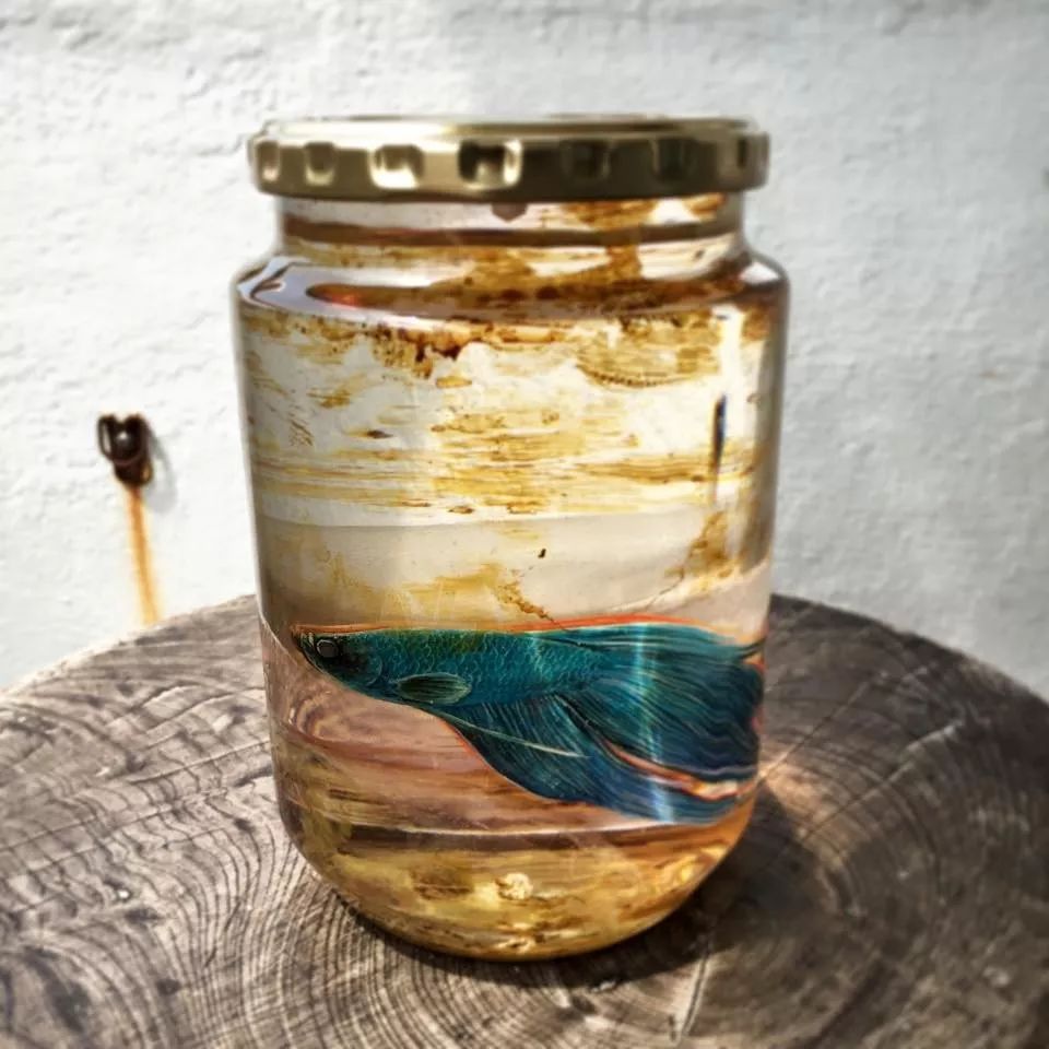 如果说画家的笔勾勒出骨架,清浅的树脂就是作品的灵魂。倒入树脂,就像生命力在丝丝注入鱼儿体内。