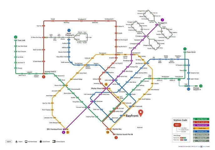 从机场出来可搭乘公共运输East West Line换Downtown Line直接到达新加坡滨海湾金沙酒店