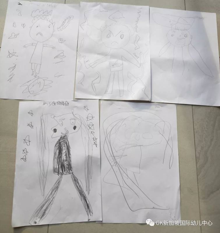 (孩子们在美术馆观察完著名雕塑《神奇的脸》后的自画像)