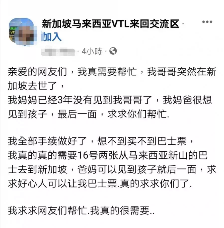 46岁越堤族因突发心脏病在狮城猝逝,家人面子书发帖求车票引起网民关注之余,也立即获得大马交通部长拿督斯里魏家祥注意,与相关的巴士公司进行协调后,协助死者父母顺利获取VTL车票。