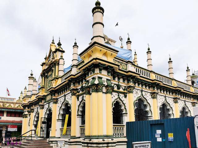 吃饱后就从牛车水搭乘MRT东北紫色线到小印度,下车后大约步行7分钟就可以抵达阿督卡夫回教堂,整个建筑相当亮眼,鹅黄色的建筑体搭配墨绿色线条很有童话风。