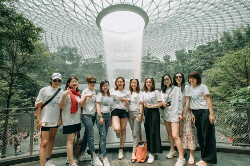 新加坡旅程4天3夜的,第一天刚到步就直接包车,把新加坡著名的地标都赶紧打卡一次,一路上配合着当地导游的介绍,重新又再次认识新加坡,一下飞机导游就把我们送到“星耀樟宜”Jewel Changi Airport ,这个整个建筑物重点肯定就是中间的40米室内大瀑布,看到大瀑布简直眼前一亮,瀑布在商场的中央,不管到啦一层都可以看到,团队同事站在那2楼一直拍,拍到都不想走了,水都打到脸,哈哈。