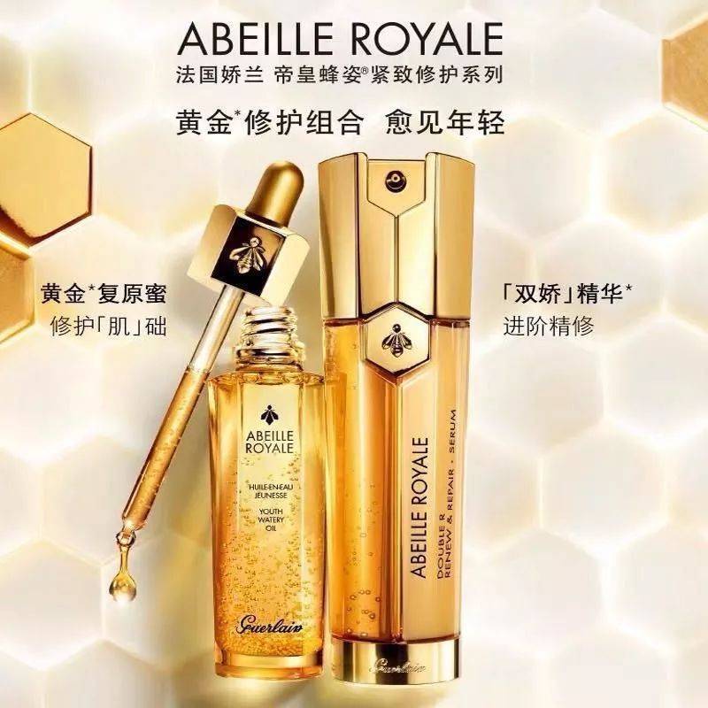 双效修护精华:法国娇兰帝皇蜂姿双效修护精华露结合帝皇蜂姿系列紧致修护科技与去角质成分,改善肌肤松弛和失去弹性、出现皱纹、暗沉、瑕疵、毛孔粗大等岁月痕迹。蕴含法国娇兰乌埃尚岛黑蜂蜂蜜和蜂皇浆,让肌肤柔滑透亮,再现自然“发光肌”。